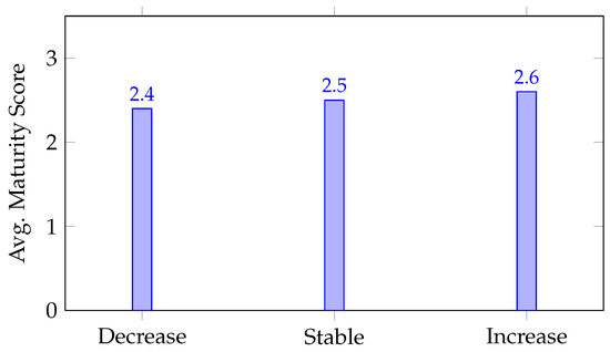 Figure 8 illustrates the average maturity score by self-reported revenue trend. Firms with a decline in revenue reported only marginally lower maturity than those with stable or increasing revenues. That suggests that digitalization alone is not sufficient to overcome broader market or structural constraints.