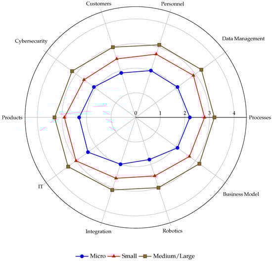 Figure 9 illustrates the distribution of the average digital maturity scores in ten standardized dimensions, disaggregated by firm size (micro, small, and medium/large enterprises). Each axis corresponds to a core capability area, including processes, data management, personnel, customer relationships, cybersecurity, products, information systems, integration, robotics, and business model adaptation. The results show a transparent size-dependent gradient: microenterprises consistently report the lowest levels of maturity, with pronounced weaknesses in robotics and system integration. Small firms achieve moderately higher scores, showing relative strengths in data management and cybersecurity, but still lag in automation-oriented dimensions. Medium and large companies obtain the highest overall values, displaying a more balanced maturity profile, with notable advantages in information systems and product digitalization. This evidence confirms the existence of a structural digital divide shaped by organizational scale, underscoring the importance of tailored support mechanisms and differentiated policy interventions to foster inclusive digital transformation.