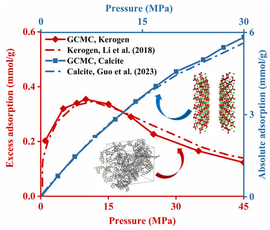 - Guo, D.; Zhang, L.H.; Li, X.G.; Yang, X.; Zhao, Y.L.; Chen, X. Effect of the Water Content on the Adsorption of CO2 and CH4 in Calcite Slit Nanopores: Insights from GCMC, MD, and DFT. Langmuir 2023, 40, 818–826. [Google Scholar] [CrossRef] [PubMed]