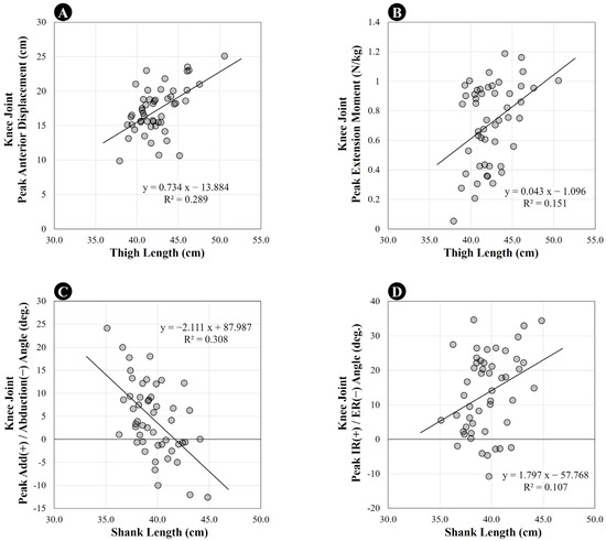 3.4. Simple Regression Analysis Between Thigh and Shank Length Variables and Knee Joint Kinematic and Kinetic Variables