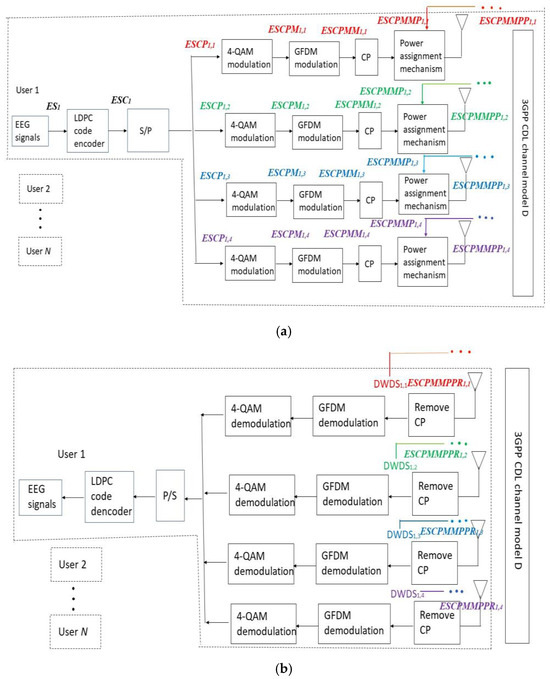 The carrier-sense multiple-access strategy with collision avoidance packet access was utilized to achieve multiuser communication. The EEG signal bit stream of the nth user ( is input into the (2000, 1000) LDPC encoder, and the LDPC encoded EEG signal bit stream of the nth user ( is output. The is input to the serial-to-parallel (S/P) mechanism, and the S/P LDPC encoded EEG signal bit stream of the lth transmission antenna for the nth user ( is output. The is input to the 4-QAM module, and the 4-QAM S/P LDPC encoded EEG signal symbol stream of the lth transmission antenna for the nth user ( is extracted as the output. The is input to the GFDM module, and the GFDM-based 4-QAM S/P LDPC encoded EEG signal symbol stream of the lth transmission antenna for the nth user ( is extracted as the output. After adding a cyclic prefix (CP), the GFDM-based 4-QAM S/P LDPC encoded EEG signal symbol stream of the lth transmission antenna for the nth user with the CP ( is extracted as the output. The is input to the PAM module, and the GFDM-based 4-QAM S/P LDPC encoded EEG signal symbol stream of the lth transmission antenna for the nth user with the CP and PAM ( is extracted as the transmission signal.