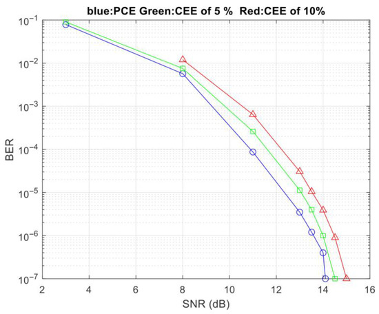 PCC performance of the 4 × 4 GFDM-based DM MIMO MECT for the nth user. (blue: PCE; green: CEE of 5%; red: CEE of 10%).