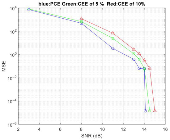 The MSE values of the proposed MECT with CEEs of 0%, 5%, and 10% with an 11.00 dB SNR are , and , respectively. As the CEE increases from 0% to 5%, and from 5% to 10%, the MSE increases by approximately , respectively. The MSE values of the proposed MECT with CEEs of 0%, 5%, and 10% with a 13.50 dB SNR are , and , respectively.