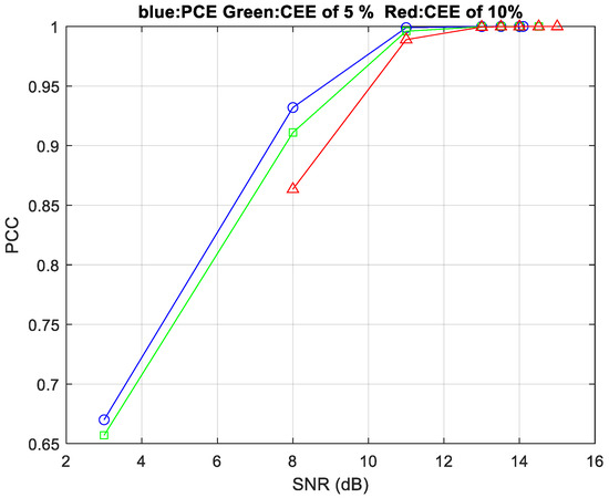 The PCC values of the proposed MECT with CEEs of 0%, 5%, and 10% with an 11.00 dB SNR are 0.99600, and 0.98898, respectively. As the CEE increases from 0% to 5%, and from 5% to 10%, the PCC decreases by approximately , respectively. The PCC values of the proposed MECT with CEEs of 0%, 5%, and 10% with a 13.51 dB SNR are 0.999935264, and 0.999810395, respectively. As the CEE increases from 0% to 5%, and from 5% to 10%, the PCC decreases by approximately , respectively.