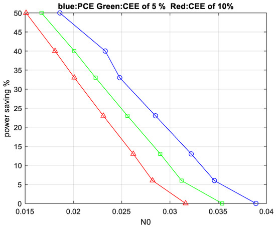 PS performance of the 4 × 4 GFDM-based DM MIMO MECT for the nth user. (blue: PCE; green: CEE of 5%; red: CEE of 10%).