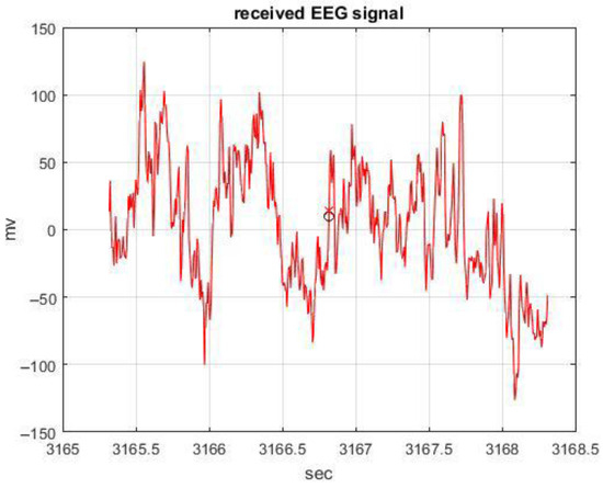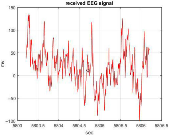 The time length and sample frequency of the simulated EEG signal are 6959.97 s, and 160 Hz, respectively. The BER, MSE, and PCC values of the proposed MECT with a CEE of 10% and a 14.51 dB SNR are 8.9799 × , and , respectively. The received EEG signal shows nine amplitude errors. Figure 6 illustrates the original EEG signal in the time interval from 5803.2125 s to 5806.2125 s. Figure 7 shows the received EEG signal with a CEE of 10% and an SNR of 14.51 dB in the time interval from 5803.2125 s to 5806.2125 s. One of the amplitude errors is at 5804.71 s, where the original and received EEG amplitudes are 11 mV and 27 mV, respectively.