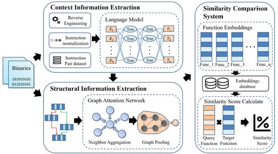 Hu et al. [8] proposed the CACompare model, which first extracts the parameters required for dynamic execution and the target of the switch statement jump from the function’s CFG, then converts the assembly functions of different architectures into a unified intermediate representation and simulates the execution, thereby extracting the semantic signature of the function, and finally judging whether it is similar through the semantic signature. Similarly, Alrabaee et al. [9] proposed the Fossil model, which captures the syntactic features of the function through the opcode frequency, captures the semantics of the function by extracting the interaction between nodes from the control flow graph, captures the behavior of the function by calculating the distribution of important opcodes and finally uses the Bayesian network to combine the results of the three components for similarity matching. Ren et al. [10] proposed the UnDiff model, which extracts statistical features related to compiler optimization from the control flow graph of the function, and compares the differences in binary code generated by the same source code under different compilation options through traditional statistical methods, thereby judging whether the binary code is compiled from the same source code. Han et al. [11] implemented a program-analysis model MalInsight for detecting malware, which analyzes the malware by considering its structural, low-level and high-level behavioral features. Although these methods perform well in specific scenarios, they are highly dependent on rule construction and lack robustness.