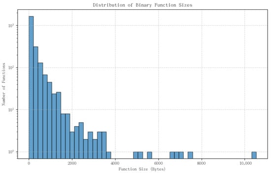 In this experimental dataset, there are a total of 208,590 binary functions, and the specific binary function size distribution is shown in Figure 3. The dataset is divided into training set, validation set and test set in a ratio of 80%, 10% and 10%.