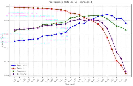 As can be seen from Figure 4, when the similarity threshold is below 0.75, the recall rate is very high, while the precision and F1-score show an upward trend. This indicates that when the similarity threshold is low, the accuracy of the model’s similarity-detection results is also low, so these results are not reliable for reference purposes. When the similarity threshold is between 0.75 and 0.87, the model’s precision and recall rate remain at a relatively high level. When the similarity threshold is set between 0.87 and 1.0, there is a rapid decline in the relationship between precision, F1-score and similarity threshold. In summary, setting the similarity threshold at a point between 0.75 and 0.87 achieves a balance between precision, recall rate and similarity threshold. When the threshold is 0.83, the model achieves a relatively balanced state between precision and recall, while the F1-score is also at a relatively high level, and the accuracy is close to the maximum value at this point, indicating that the overall prediction accuracy of the model is high. Therefore, subsequent experiments all use this threshold as the default setting for similarity judgment to ensure the robustness and reproducibility of the results.