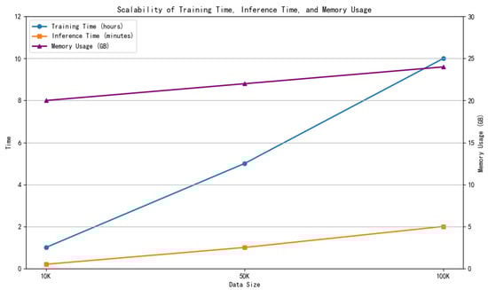 To comprehensively evaluate the resource consumption and scalability of the proposed method, we conducted large-scale experiments on an RTX 4090 GPU, measuring the average training and inference times, GPU memory usage and scalability performance across different data scales. Figure 5 shows that as the data scale expands from 10 K, 50 K to 100 K, the memory usage increases gradually, while the training and inference times increase linearly, demonstrating good scalability and resource efficiency. This method not only has advantages in detection performance but also meets the requirements of large-scale applications in terms of computational resources and scalability.