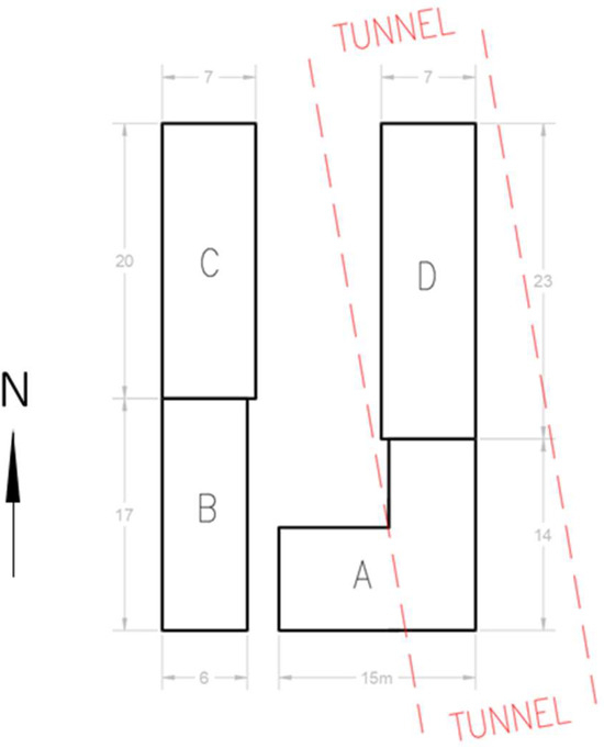 The building selected for analysis is considered as representative of masonry structures located within the dynamic influence zone of the analysed tunnel section. Analysed development consists of two parts, each composed of two segments. The part located above the tunnel comprises segments A and D, while the part situated outside the tunnel consists of segments B and C—see Figure 1. Each segment was constructed in 1930 using traditional masonry techniques. Spatial rigidity is ensured by a transverse–longitudinal arrangement of load-bearing walls. Each segment was directly founded on brick footings at a depth of 1 m.