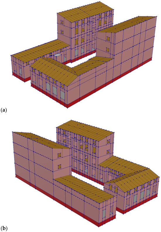 Visualisation of the FEM computational model of the analysed building: (a) South East view, (b) South West view.