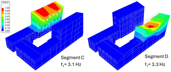 In Equation (1), H is the height of the building from the foundation level in meters. In the analysed case, H is 14.6 m and the basic vibration frequency is 3.4 Hz for segments C and D (the same height). The first mode of natural vibrations calculated on the basis of the FEM model and the corresponding mode of natural vibrations for segments C and D are shown in Figure 3. Therefore, the difference in vibration frequency according to Formula (1) and FEM analyses is as follows: for segment C 9%, and for segment D 3%. Therefore, the computational model has been positively verified.