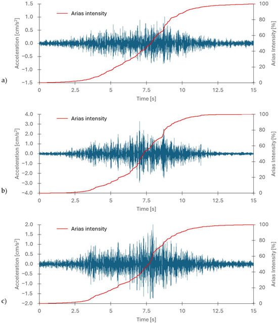 Horizontal x, y (a,b), and vertical z (c) components of the calculated acceleration records.