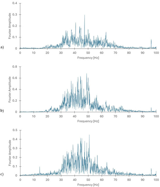 FFT analyses of the horizontal x, y (a,b), and vertical z (c) components of calculated acceleration records from Figure 5.