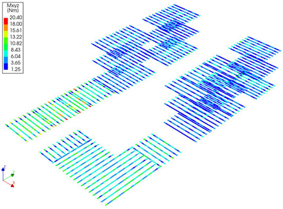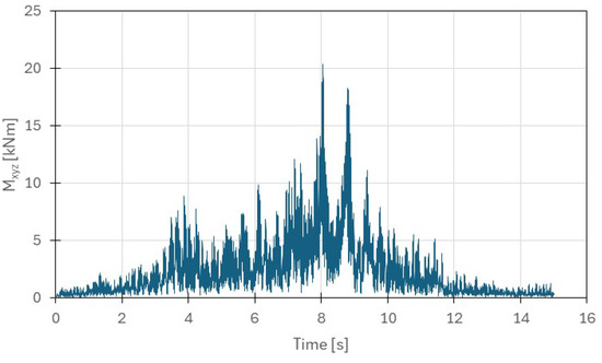 The results of dynamic calculations conducted using direct integration of the equations of motion are presented as envelopes covering the entire time domain of the event. The paper presents the results for the selected final solution with a vibration isolation mat located under the sub-base. This solution facilitated the execution of the concrete subgrade layer using the slipform method, significantly speeding up construction work. This solution is an alternative to the most commonly used solutions in the form of a vibration isolation mat located directly under the track slab. The solution has proven to be equally effective, while also being faster to implement. The results are presented for wooden ceiling elements (beams) and masonry walls. Due to the type of interaction, these elements are most critical to the safety of the structure. The envelope of bending moments in the wooden beams is shown in Figure 7. The maximum values of bending moments do not exceed 21 Nm. This translates into small bending stresses in the wooden beams, approximately 11 kPa. The calculations confirm that dynamic interactions have no effect on the supporting structure of the wooden ceilings. Moreover, the highest stress is incidental, lasting less than 1 s. Figure 8 shows a graph of the variation of the bending moment at a selected point (the mid-span of the wooden beam) during the train’s passage.