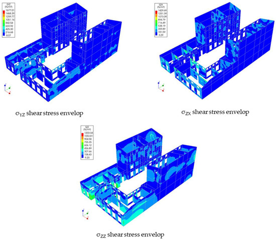 In the case of dynamic stresses in masonry elements, it should be noted that the stress level is low (see Figure 9). For horizontal stresses YZ and XZ, the extreme values do not exceed 1.7 kPa. The obtained value can be positive or negative due to the significantly variable excitation. These values are not significant compared to the minimum standard shear strength of masonry along bed joints. For comparison, a brick wall with cement-lime mortar has a minimum wall strength of 200 kPa. Of course, this value also depends on the compressive stress and may be higher. Therefore, there is no risk of damage to the masonry structure due to shear stress. For vertical stresses occurring perpendicularly to bed joints, the values do not exceed 1.3 kPa. This is also a small value compared to the compressive stresses occurring from the dead weight, which can reach up to 1.0 MPa, which completely compensates for the additional dynamic stresses, which are tensile in nature. In such a situation, there is no risk of tensile stresses arising from the combination of permanent and dynamic loads. The situation is somewhat different in specific locations, such as the corners of window or door openings. There, the stress concentration and the complex direction of the principal stresses can lead to greater stress on the wall in this area. However, this does not completely affect the structural safety of the entire building.