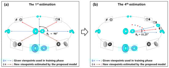 Schematic illustration of the 360-degree multi-view acquisition process in an object-centered environment, as utilized in the proposed deep learning framework. The model is initially trained on 2n evenly distributed viewpoints (indicated by blue lines or dots), corresponding to central angles defined by , where 2 ≤ n ≤ 9 (n is a natural number). Following training, the proposed model estimates depth maps for 2n novel viewpoints (represented by red lines or dots) interleaved between the original positions. (a) Example for n = 2, or central angle θ2 = 90°: The proposed model is trained on 4 viewpoints and estimates 4 additional intermediate viewpoints. (b) Example for n = 5, or central angle θ5 = 11.25°: The proposed model is trained on 32 viewpoints and estimates depth maps for 32 new positions. This process demonstrates the progressive refinement of viewpoint sampling for high-fidelity 360-degree holographic 3D content generation.