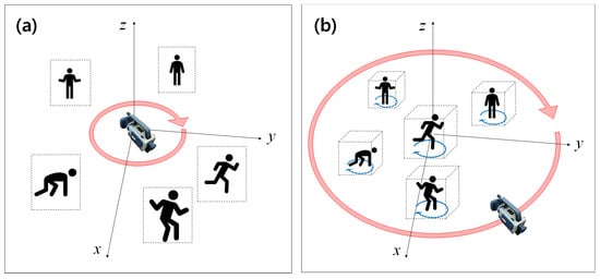 Difference between (a) camera-centered environment and (b) object-centered environment. In the camera-centered environment, this setup inherently limits the acquisition of comprehensive RGB–depth data for all possible object directions. In contrast, the object-centered environment enables the systematic capture of RGB–depth map pairs from all possible directions around the object. This comprehensive data acquisition is more suitable for 360-degree holographic content.