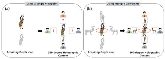 A 360-degree holographic 3D content representation via multiple-viewpoint depth map estimation. (a) Single viewpoint case: Only the user at viewpoint a can observe the holographic content, as it is impossible to view the holographic content from positions where the depth map is missing. (b) Multiple viewpoints case: All users (a, b, c, and d), regardless of viewpoint, can observe the holographic content because depth maps have been acquired for all viewpoints.