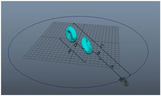 Geometry of the data acquisition conditions for RGB and depth map images from a pair of 3D objects. (A) Distance from virtual camera to 255 depth. (B) Margin from depth boundary to object. (C) Distance from virtual camera to 0 depth. (D) Distance between two objects (center to center). (E) Distance from 0 depth to 255 depth.