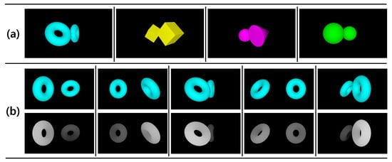 Representative data sets utilized in the experiment. (a) Four distinct 3D object types—torus, cube, cone, and sphere—were designed to create comprehensive 360-degree, multi-view datasets for the proposed framework. (b) Example of a typical dataset (torus case): For each set, both an RGB image and a corresponding depth map were systematically captured at each viewpoint along a circular trajectory, ensuring uniform angular sampling around the torus objects []. In the illustrated case, the virtual camera acquired images at rotational angles of 0°, 72°, 144°, 216°, and 288°, respectively.