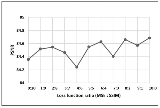 Peak Signal-to-Noise Ratio (PSNR) performance for various coefficient ratios of Mean Squared Error (MSE) and Structural Similarity Index (SSIM) in the loss function. The highest performance was observed with 100% MSE and 0% SSIM.
