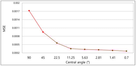where yi represents the ground truth pixel value, and yi′ represents the predicted pixel value, and n is the total number of pixels. The trend of MSE with respect to the central angle used for training the proposed model is shown in Figure 8.
