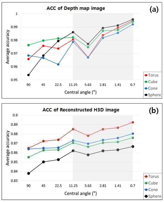 (a) Trends in the average accuracy (ACC) for depth map images as a function of the central angle. (b) Trends in the average accuracy (ACC) for the numerically reconstructed holographic 3D (H3D) images as a function of the central angle.