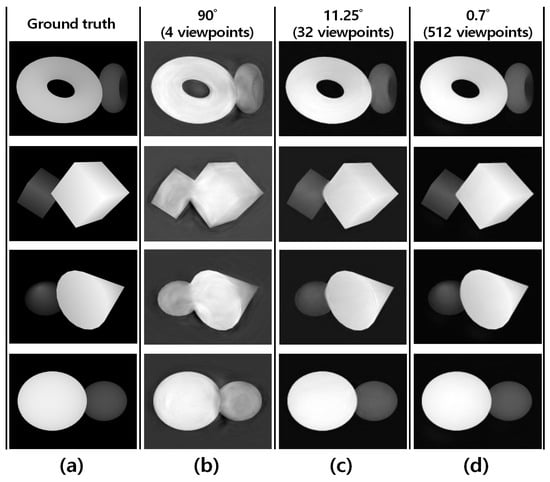 In our experiments, we progressively increased the number of viewpoints, corresponding to angular intervals of 90°, 45°, 22.5°, 11.25°, 5.63°, 2.81°, 1.41°, and 0.7° (i.e., 4, 8, 16, 32, 64, 128, 256, and 512 viewpoints). While detailed quantitative and qualitative results are presented for representative angles (90°, 11.25°, and 0.7°), all intermediate angles were also evaluated. The results consistently support the overall trend of performance improvement across the full range of angular resolutions.