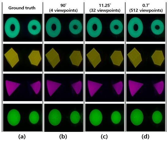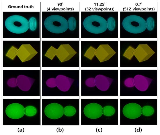 As shown in Figure 9b, we also obtained results for reconstructed H3D image comparisons that were similar to the ACC trends observed in depth map estimation. For all types of 3D shapes used, the ACC increased as the central angle decreased, reaching a maximum at 11.25°, then dropped at 5.63°, and subsequently increased again. This trend was consistent for both depth maps and reconstructed H3D images. In general, a smaller central angle leads to greater improvements in the quality of depth map estimation for 360-degree holographic content. The ACC values for both the estimated depth maps and the reconstructed H3D images increased as the central angle decreased, except for a local minimum at 5.63°. However, once the central angle passed 11.25°, the rate of improvement diminished. To visually confirm the differences associated with various central angles, qualitative comparison of reconstructed H3D images are presented in Figure 11 and Figure 12.