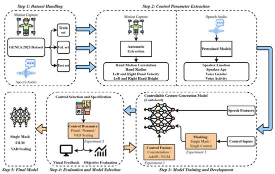 In this paper, we propose a controllable gesture generation model based on the Transformer encoder-decoder [10,11], named Cont-Gest, that enables selective control activation. Furthermore, to facilitate its development and systematic evaluation, we also propose an evaluation-driven development (EDD) workflow, which provides a systematic and iterative approach to model development throughout the evaluation-based experimentation process, as can be seen in Figure 1. The EDD workflow consists of five steps: (i) dataset handling and preprocessing, which cleans up the dataset and splits it into train, validation, and test set; (ii) control parameter extraction; (iii) model development and training—we explore six model configurations that vary in control masking paradigms and fusion strategies, iteratively refining performance through continuous evaluation; (iv) the evaluation and model selection step, where each proposed model was assessed iteratively using both objective metrics and subjective visual feedback; and (v) the final model, which was selected based on iterative evaluations of the proposed experiments.
