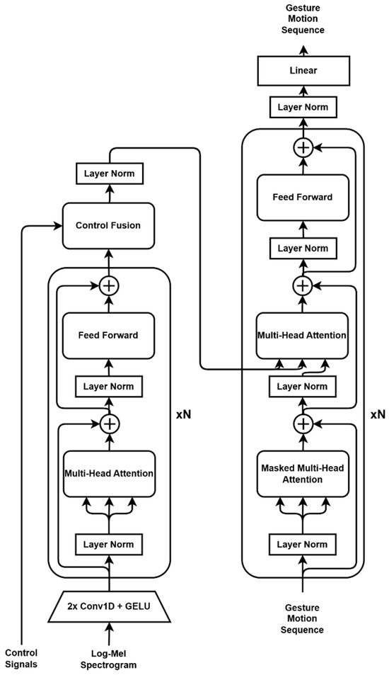 The proposed model is based on the Transformer architecture [10], specifically on the Whisper architecture, which was introduced for automatic speech recognition [11]. We incorporated the specifics of the Whisper architecture, where the encoder consists of two convolution layers with a filter width of 3, and the GLEU activation function. Additionally, we used pre-activation residual blocks and final layer normalization. A key difference between our Cont-Gest model and the Whisper model is the absence of positional embeddings, which we found to degrade performance. Therefore, the final Cont-Gest model is trained with 4 heads, 3 layers, and a width of 256, resulting in 6.8 million trainable parameters. This model size can be considered extra small compared to the Whisper Tiny model, which has 39 million parameters with 4 layers and 6 heads. Figure 4 presents the Cont-Gest model architecture, showing the main Transformer structure and control integration approach.
