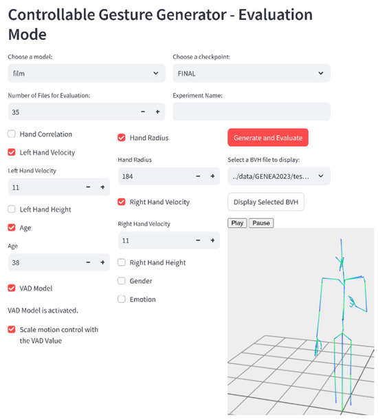 To facilitate evaluation-driven model development, we developed a graphical interface tool for visual feedback, presented in Figure 5. This tool features several sliders, dropdown menus, and a preview of the generated gesture motion, enabling easy manipulation and observation of the control parameters’ effects. The graphical interface is organized into three sections using the Streamlit library and ThreeJS for BVH motion file visualization. The first section allows us to specify the model’s name, selected checkpoint, number of evaluation files, and experiment title. The second section then provides us with all controls to activate or deactivate specific control parameters. Finally, the third section animates the generated gestures, enabling visualization of each generated motion. It is important to note that this graphical interface only represents our experimental setup and is not intended to be used by the end users. Accordingly, we do not report quantitative analyses of user interactions or feedback.