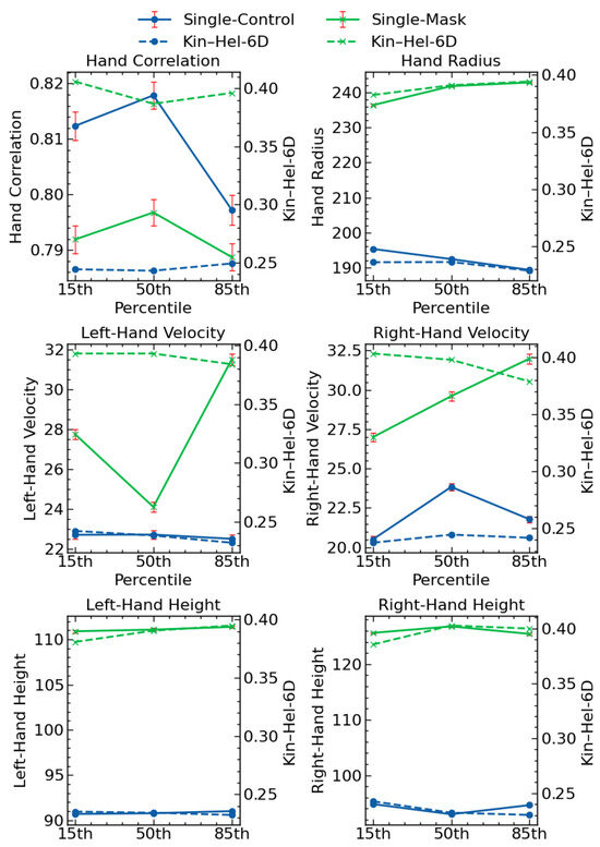 In Figure 6, the results for the first experiment show that, despite identical training data, models learned to handle control parameters differently based on their training paradigm. Models trained with the single-control paradigm achieved superior objective evaluation scores (lower Kin–Hel-6D values), likely because frequent exposure to scenarios with most controls masked during training led to more robust motion generation. This improved motion quality, however, came at the cost of reduced control responsiveness.