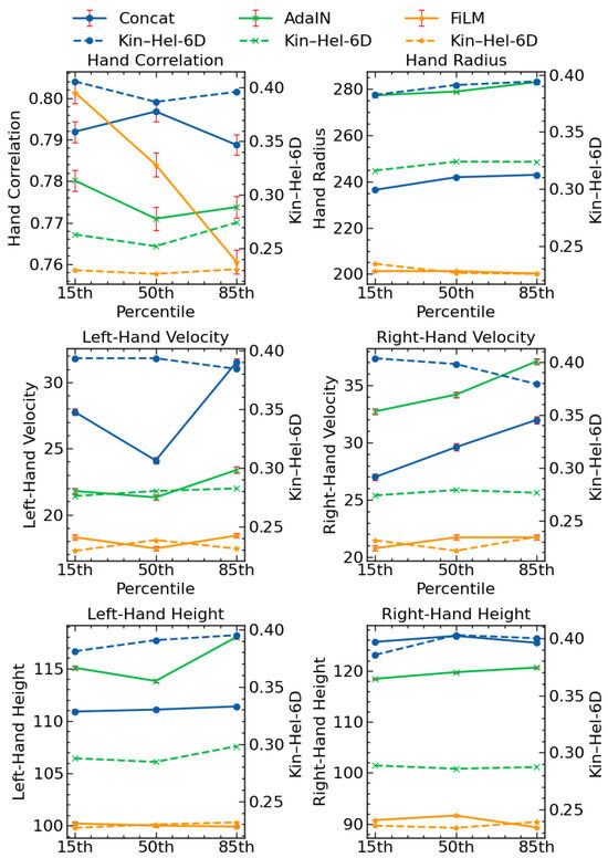 Building on Experiment 1’s evaluation of training paradigms using concatenation as the baseline fusion method, this experiment compares different control fusion techniques: AdaIN [13] and FiLM [12]. All models were trained using the single-mask paradigm since it showed better control responsiveness. Figure 7 shows the influence of different fusion techniques on control parameter responsiveness. While none of the models achieved precise control adherence, concatenation and AdaIN demonstrated superior performance in tracking control trends compared to FiLM. This was most evident for right-hand velocity and hand radius controls, where output motion increased consistently with higher input values. Regarding the trade-off between control responsiveness and motion quality, AdaIN achieved control performance comparable to concatenation while producing higher overall motion quality. In contrast, FiLM showed minimal responsiveness to control inputs but generated the highest motion quality according to the 6D Kinetic–Hellinger distance metric. This suggests a fundamental trade-off between control precision and motion naturalness across different fusion approaches.