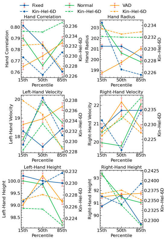 Since FiLM conditioning achieved the best evaluation score in Experiment 3, we further analyzed how to improve controllability with control dynamics. Figure 8 demonstrates how different control dynamic approaches affect the performance of FiLM conditioning. The fixed control approach proved ineffective, with the model failing to follow intended control parameters and exhibiting negative trends for nearly all parameters except right-hand velocity. Normal distribution sampling provided no substantial improvement over the fixed approach, suggesting that random variation alone is insufficient to enhance control responsiveness. In contrast, VAD scaling yielded significantly better results, producing positive control-following trends for hand correlation, hand radius, left-hand velocity, and right-hand velocity. For the remaining parameters, VAD scaling initially showed positive trends at the 15th and 50th percentiles before reversing to negative trends at the 85th percentile.