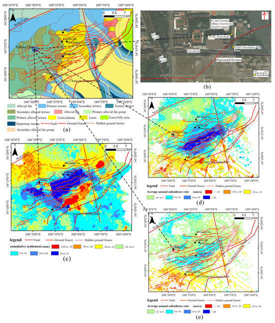 - Sun, Y.; Yang, T.; Lu, Q.; Liu, C.; Zhan, J. Spatial-temporal evolution characteristics of land subsidence and ground fissure in yuhua village of xi’an city using sbas-insar technique. J. Eng. Geol. 2022, 30, 553–564. [Google Scholar]