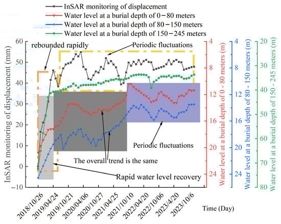 According to the water level monitoring data at a depth of 245 m (Figure 2), the depth of the monitoring well, and the stratigraphic structure of the upper side and footwalls, the area was divided into a phreatic aquifer and two confined aquifers. The buried depth of the phreatic aquifer is 0–80 m, the buried depth of the first confined aquifer is 80–150 m, and the buried depth of the second confined aquifer is 150–245 m. The InSAR monitoring data was divided into two stages. The first stage was the rapid rebound stage (from October 2018 to March 2019). The second stage was the recovery stage with large fluctuations, which were within 1 mm.