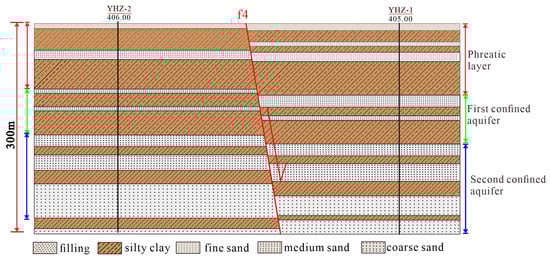 According to the formation’s structure and the depth of the monitoring well, the aquifer within 300 m was divided into the phreatic layer and the first and second confined aquifers (Figure 3). The buried depth of the first and second confined aquifers was 100–176 m and 176–300 m, respectively. The first confined aquifer was divided into two water-bearing sections, and the second confined aquifer was divided into four water-bearing sections. The 0–96 m depth range of the footwall formation was the phreatic aquifer, and the buried depths of the top and bottom plates of the first and second confined aquifers in the hanging wall were 96–166 m and 166–300 m, respectively. The first confined water-bearing component was divided into two water-bearing sections, and the second confined water-bearing rock component was divided into three water-bearing sections.