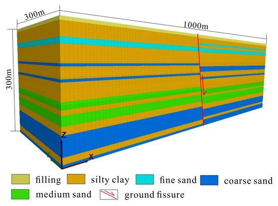 According to the stratigraphic structure in Table 1, a three-dimensional geological model was established using FLAC3D 6.0 software (Figure 4). The length (x direction) was 1000 m, the width (y direction) was 300 m, and the height (z direction) was 300 m. A ground fissure with a length of 500 m and an angle of 80° was placed at the bottom of the top surface in the x direction.