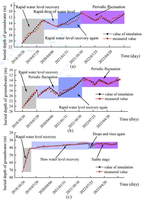The fluid–solid coupling model in FLAC3D 6.0 was used to establish different initial water heads for the phreatic and confined aquifers. A change in pore water pressure was achieved by pumping or adding water to the sand layer in the phreatic and confined aquifers. The changes in water level for the different aquifers are shown in Figure 5. The agreement between the simulated and measured values is high, with the second confined aquifer achieving the best simulation performance.