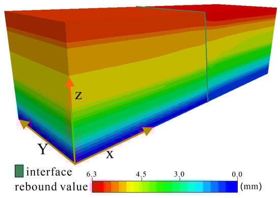 Figure 7 shows the numerical simulation results and the InSAR surface monitoring values for the hanging wall. The simulated displacement rebound values are 63 mm for the hanging wall and 55 mm for the footwall. The value derived from InSAR monitoring is 53 mm. The displacement trend is similar for the numerical simulation and the InSAR data. The reason for the small error is that the model simplifies the formation’s structure. The simulated rebound value of the hanging wall for the second confined aquifer is 38.32 mm, accounting for 61.12% of the total rebound amount. That of the first confined aquifer is 7.69 mm (12.26%), and that of the phreatic aquifer is 16.69 mm (26.62%). The rebound amount of the footwall for the second confined aquifer is 22.14 mm (79.63%), and that for the first confined aquifer is 2.5 mm (4.39%). The rebound amount for the phreatic aquifer is 8.9 mm (15.99%). These results indicate that the second confined aquifer contributes the most to the total rebound.