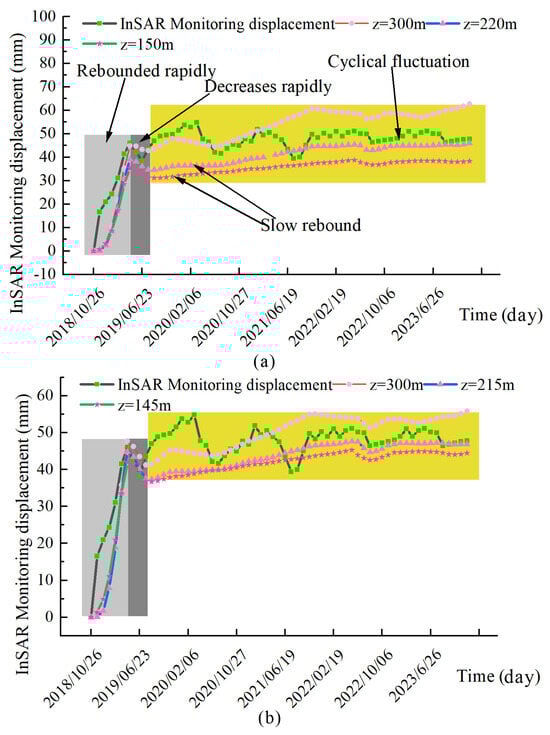 InSAR data monitoring results of the displacements of the layers: (a) Hanging wall; (b) Footwall. Note: Light gray in the figure represents the rapid rebound phase, dark gray represents the slight decline phase, and yellow represents the volatile rebound phase.