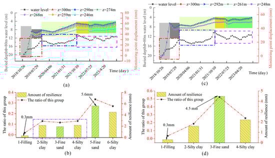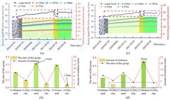 The deformation trend at the monitoring points on the hanging wall and the footwall of the phreatic aquifer is consistent with the water level fluctuations. The relative downward displacement is slightly smaller for the lower soil layer than for the upper soil layer, indicating that the influence on the upper soil layer is larger for the same water level fluctuations. The change in the water level can be divided into three stages (Figure 8a,c). The red box represents the rapid recovery stage of the water level, the blue box indicates the recovery stage, and the purple box indicates the stable water level stage, when small cyclical fluctuations occur. The soil displacement can be divided into five stages (Figure 8a,c). The light-gray rectangle indicates the rapid rebound stage of the soil. The dark-gray rectangle indicates that the soil exhibits low compression and rebound, with a cumulative rebound amount of approximately 0. The light-yellow rectangle denotes the rebound of the soil. Some compression occurs in the early stage. The dark-yellow rectangle indicates slight compaction. The green rectangle indicates that the soil is relatively stable, with a small amount of rebound. The colors in Figure 8, Figure 9 and Figure 10 have the same meaning.