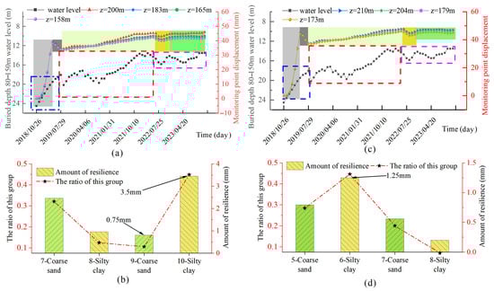 The displacement trend and the water level changes of the layers of the first confined aquifer are the same as above. However, it is observed that a small decrease in the water level does not affect the trend of the soil rebound in the layers, but the rate of rebound decreases (Figure 9a,c). During the rise in the water level, the rebound amounts of the fine sand in the 7th layer and the silty clay in the 10th layer of the hanging wall are substantially larger than those of the other layers. The cumulative rebound value of the hanging wall is 7.69 mm (Figure 9b), of which the sand layer accounts for 42.63% of the total. The rebound amounts of the fine sand in the 7th layer and the silty clay in the 10th layer of the footwall are larger than those of the other layers. The cumulative rebound value of the footwall is 2.8 mm (Figure 9d), and the sand layer accounts for 48.31% of the total. The cumulative rebound value of the hanging wall is 4.89 mm larger than that of the footwall. The thickness of the upper sand layer accounts for 31.58%, and that of the clay layer accounts for 68.42%. The thickness of the sand layer in the footwall accounts for 17.14%, and that of the clay layer accounts for 82.65%. The thickness ratio of the upper sand layer is greater than that of the lower sand layer.