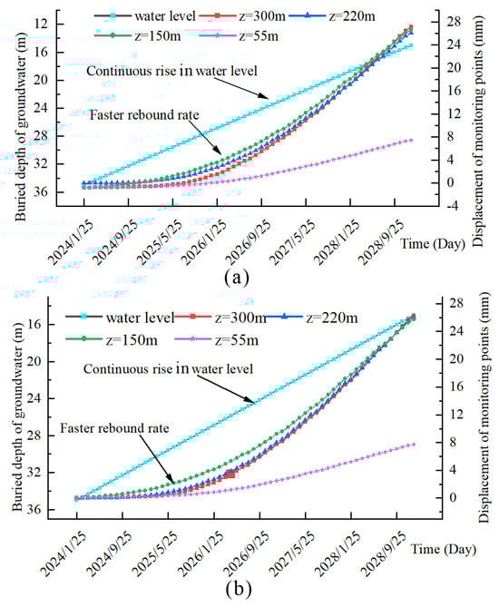 Due to the differences in the permeability coefficient between the clay and sand layers, the pumping speed affects land subsidence [,,,]. Short-term rapid pumping causes a sharp drop in the water level, creating a significant hydraulic gradient. The clay layer has low permeability and slow drainage, which may generate temporary high water pressures, exacerbating the risk of subsidence. Long-term slow pumping results in a slow decline in the water level and a larger settlement area with a lower settlement rate because the water in the clay layer has sufficient time to drain. As a result, the settlement is more uniform, but the cumulative settlement is higher. The rate of water level rise significantly affects ground rebound. The simulation time is long when the water level rises slowly.