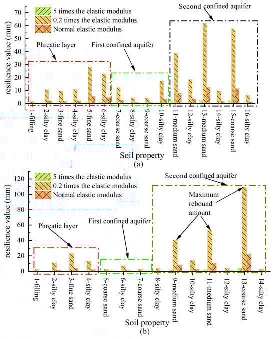 The modulus of elasticity significantly affects the numerical simulation results [,,,]. An increase in the modulus of elasticity increases the ground stiffness and reduces settlement. Therefore, we selected elastic moduli that were 5 times and 0.2 times the normal value of the sand and clay layers, respectively, and compared the rebound values of the layers under the same water level recovery conditions. The rebound values of the hanging wall’s layers (Figure 12a) and the footwall’s layers (Figure 12b) are significantly larger for an elastic modulus that is 0.2 times larger than one that is 5 times larger than the normal value. This result shows that the elastic modulus has a linear correlation with the rebound, helping to select parameters.