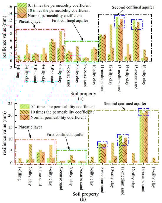 Different permeability coefficients have varying effects on the different layers. In the second confined aquifer, the rebound value of the sand layer in the hanging wall (Figure 13a) and the footwall (Figure 13b) is the largest at 0.1 times the normal permeability coefficient, and the rebound value is the smallest at 10 times the normal permeability coefficient. Thus, the lower the permeability coefficient of the sand layer, the larger the rebound resulting from a rise in the water level. However, the opposite is observed for the phreatic aquifer and the first confined aquifer, i.e., the higher the permeability coefficient, the larger the rebound in the sand and clay layers. As the water level in the sand layer rises, the pore pressure increases, resulting in a pore pressure difference between the sand and clay layers. A high permeability coefficient of the clay layer facilitates water seepage, leading to rapid increases in pore water pressure, reducing the effective stress of the soil, and increasing the rebound. Therefore, we observed similar responses in the phreatic aquifer and the first confined aquifer.