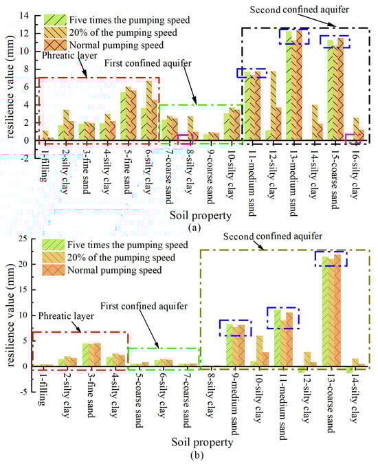 We utilized rates of water level rise that were 5 and 0.2 times the normal rate to analyze the rebound in different soil layers under the same water head condition. In the second confined aquifer, the rebound values of the sand layers of the hanging wall (Figure 14a) and the footwall (Figure 14b) are the largest at the normal rate of water level rise and the smallest at 0.2 times the normal rate. In the phreatic aquifer and the first confined aquifer, the rebound of the sand layer is the largest at 0.2 times the normal rate and the smallest at 5 times the normal rate. The rebound of the clay layer in the three aquifers is the largest at 0.2 times the normal rate and the smallest at 5 times the normal rate. The rate of water level rebound has a larger influence on the clay layer than on the sand layer due to the large difference in the permeability coefficient.